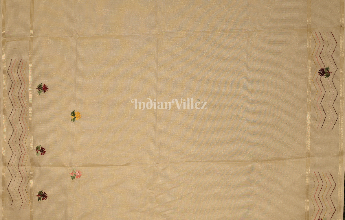 Beige Tusasr Silk Saree with Floral Embroidery Work