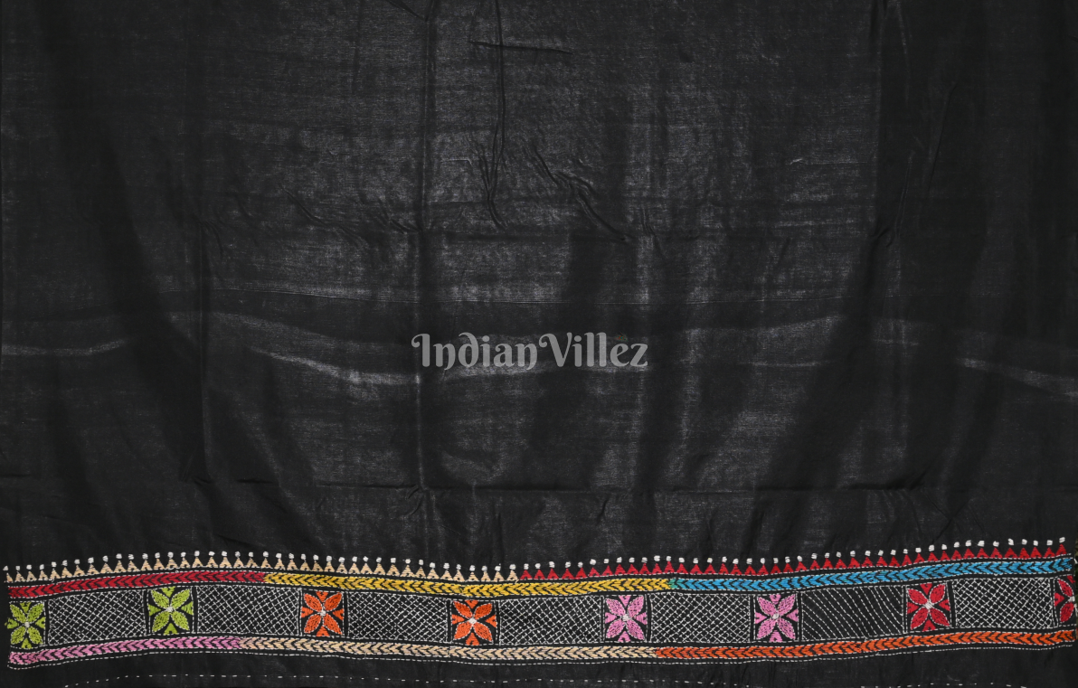 Black Handwoven Kantha Stitch Silk Saree