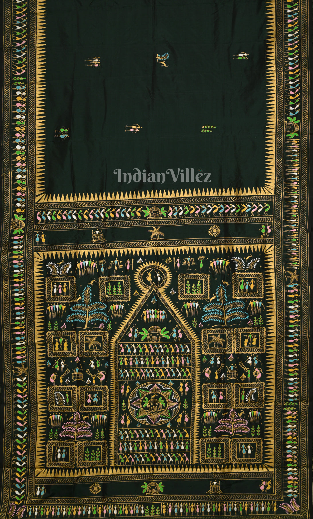 Bottle Green Saura Tribal Art Hand-Painted Pattachitra Saree