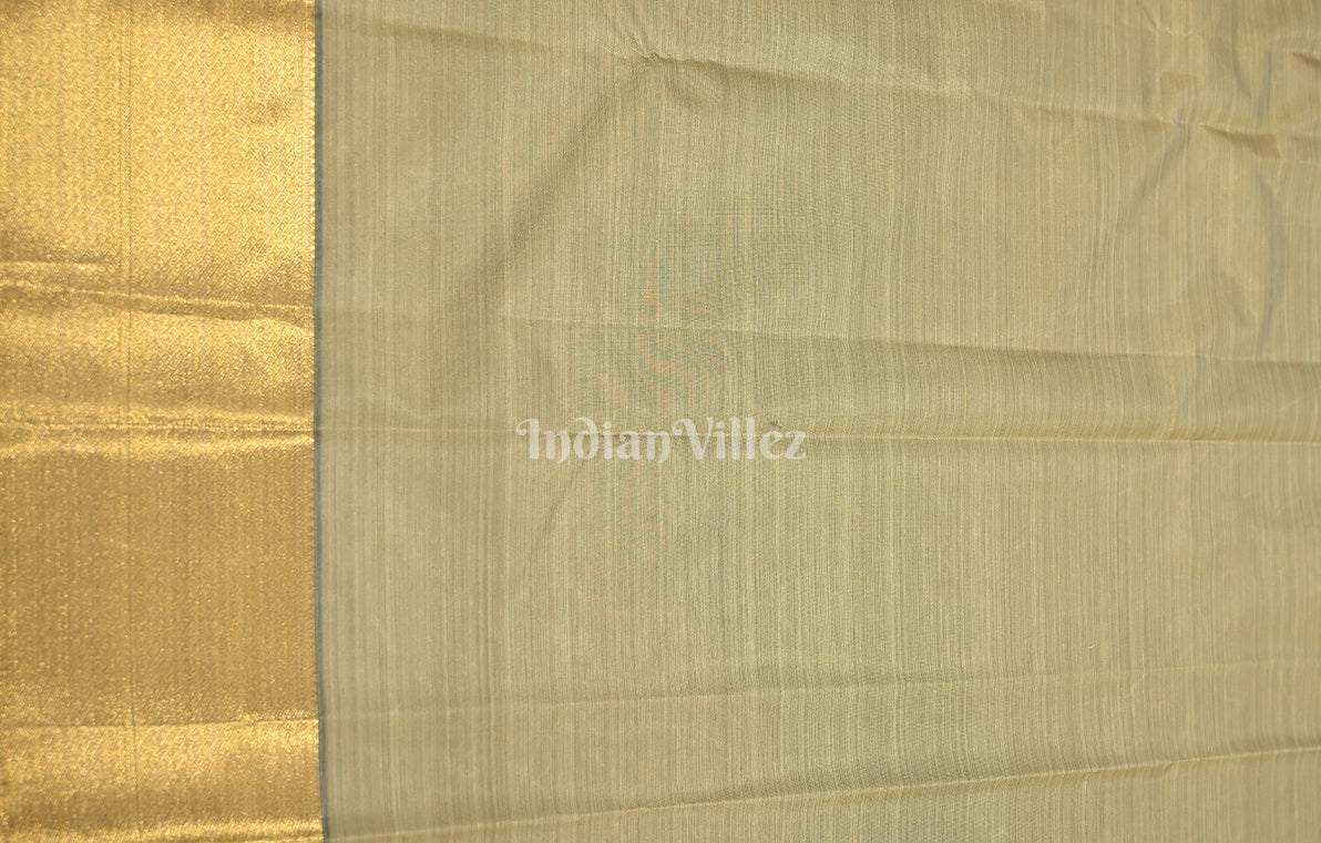 Golden Base Kanchipuram Silk Saree with Zari Brocade on the body and Zari Border. Includes unstitched blouse.