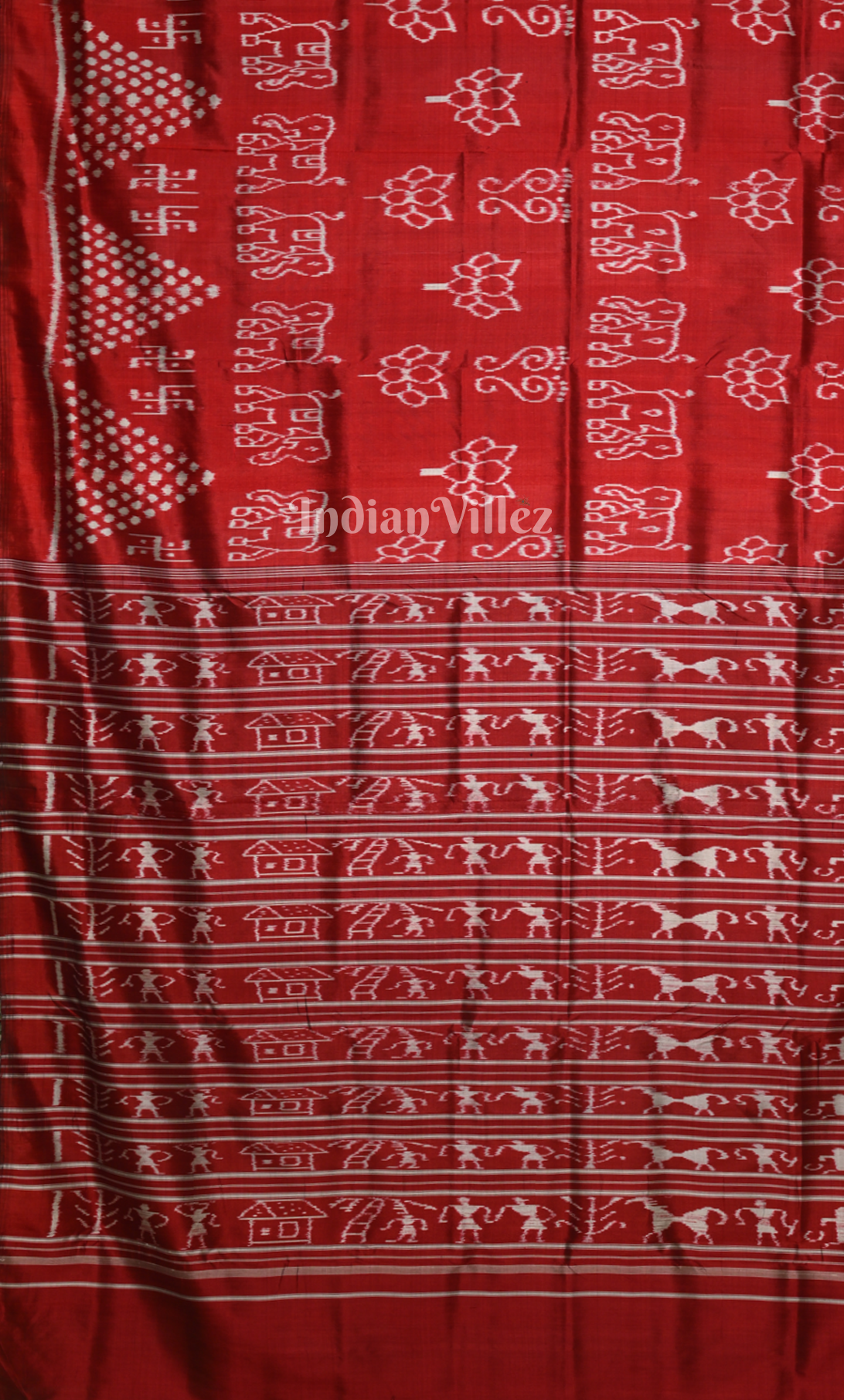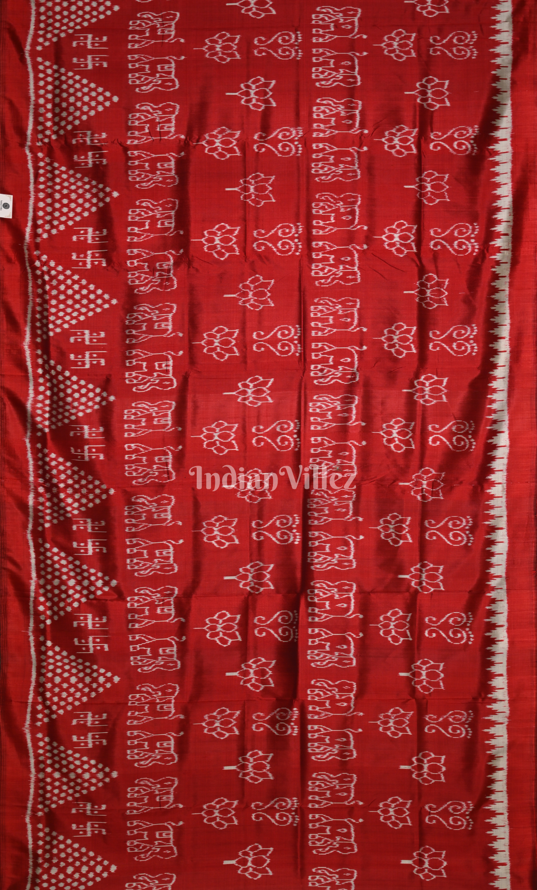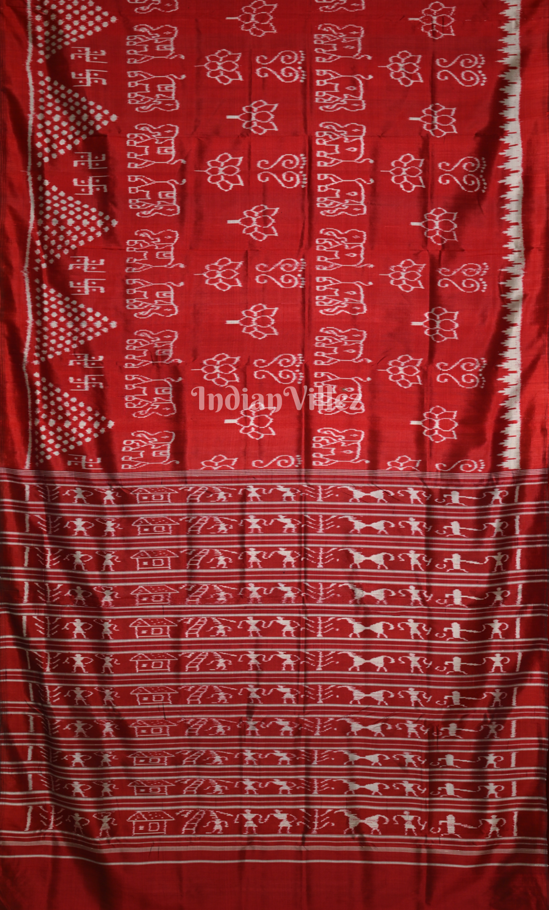 Laxmi-Pada means Goddess Laxmi's feet. The motif and design has been inspired by Jhotis used for Laxmi Puja in different parts of Odisha. The body of the Odisha Handloom is maroon with khoti motifs inspired by Laxmi feet and other Jhotis. The palla of the saree has elements of green creepers which are enhance the look of the Odisha Ikat. The Gorgeous piece of Handloom comes with a blouse piece and is one of kind to have in wardrobe.