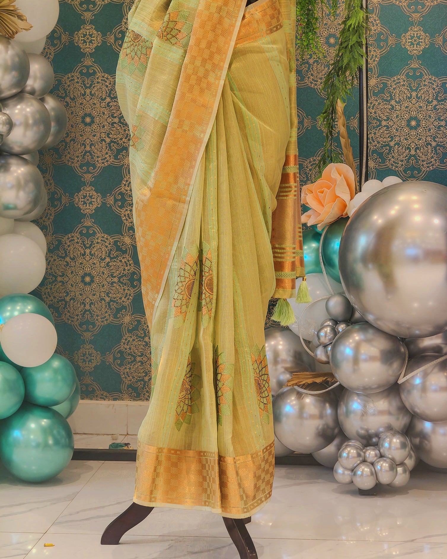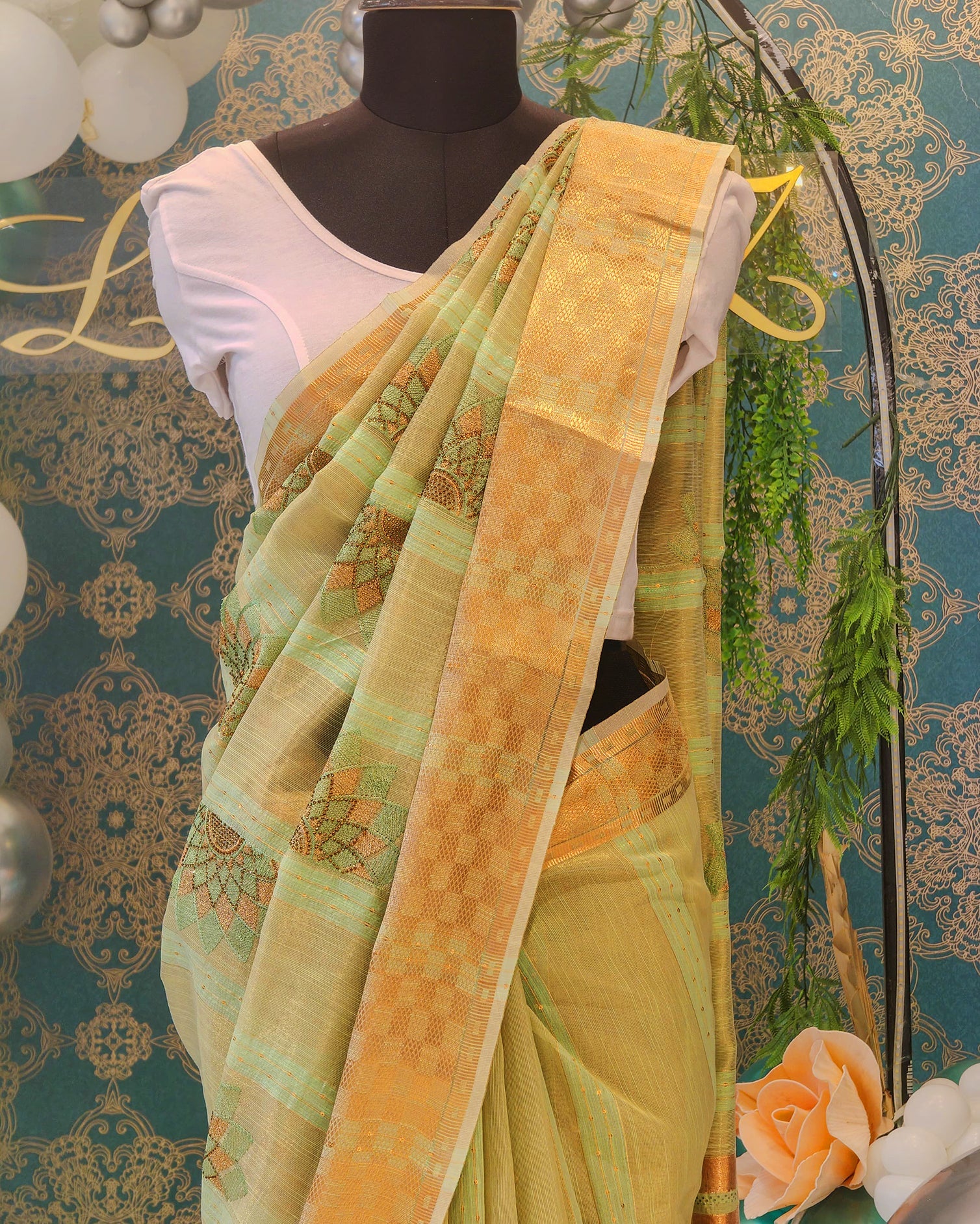 Light Green Floral Linen Tissue Saree with Sequence Work