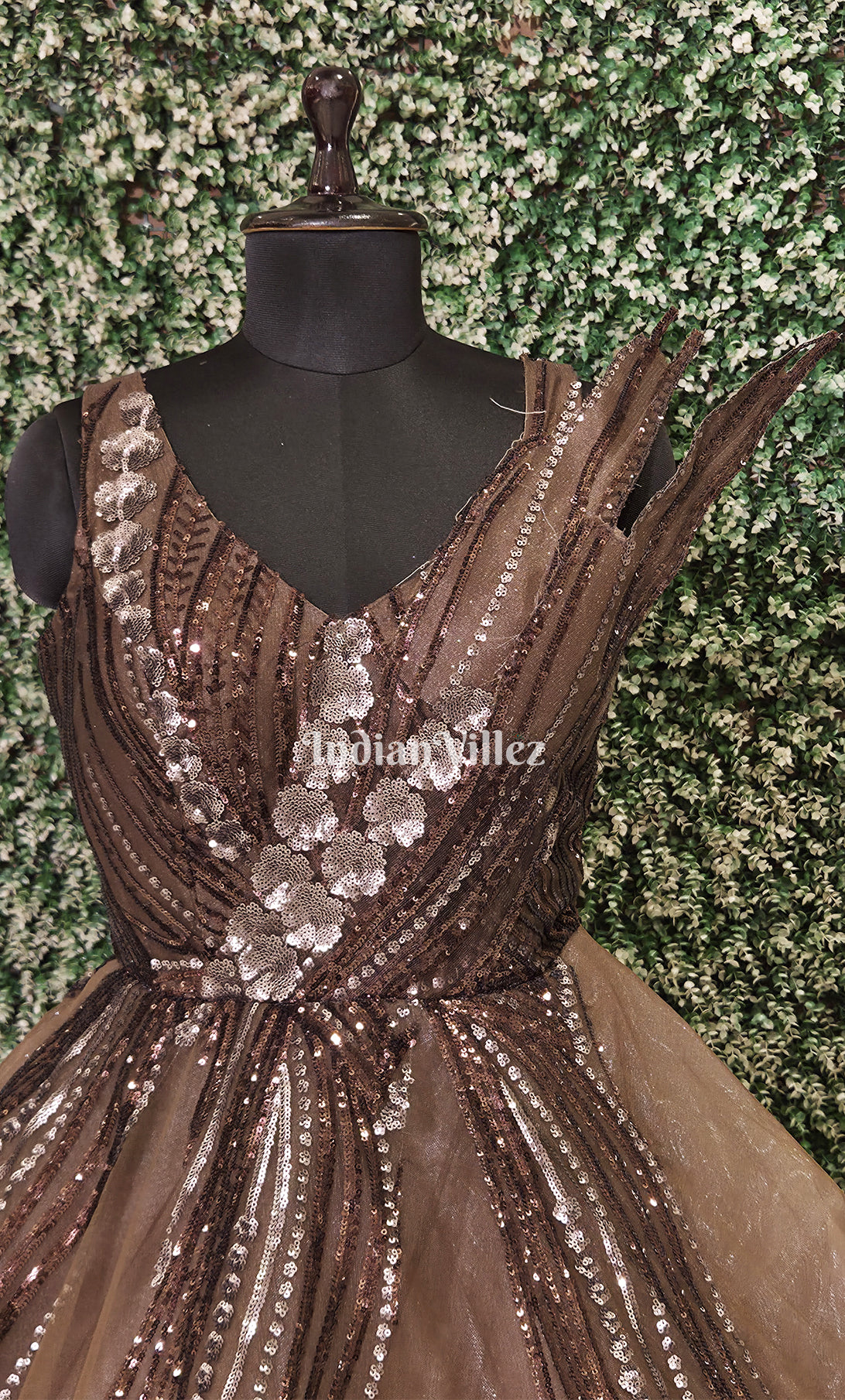 Party Wear Brown Net Indowestern Gown with Sequins Embroidery