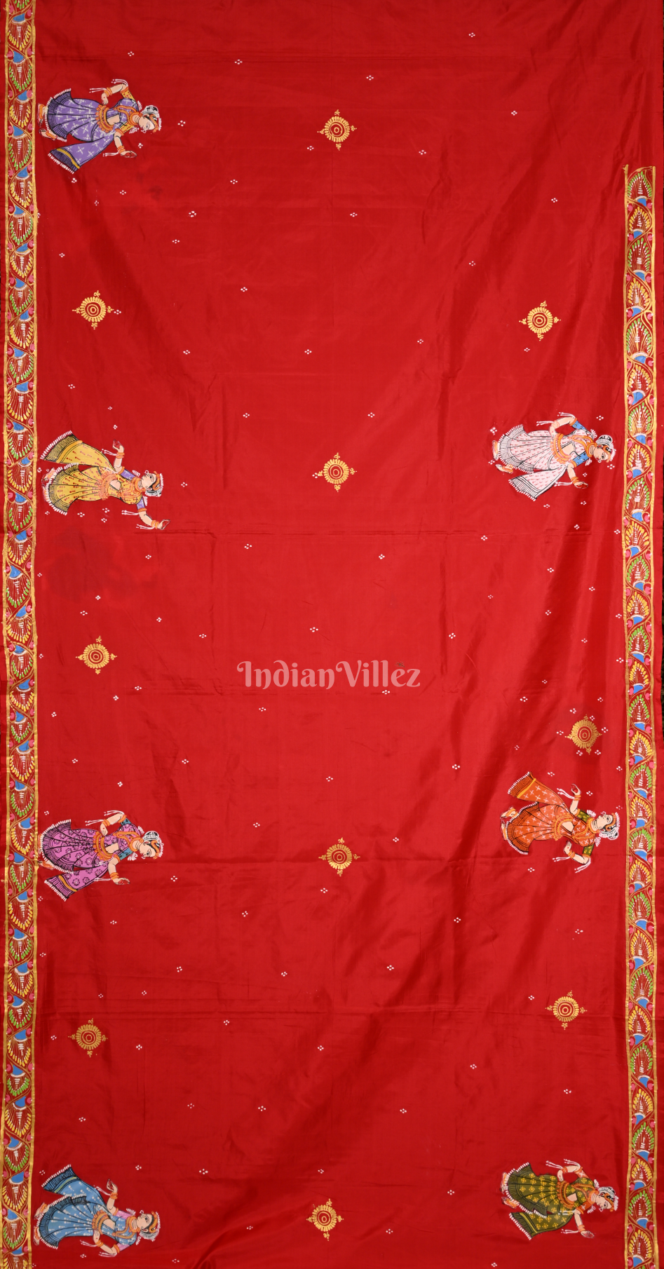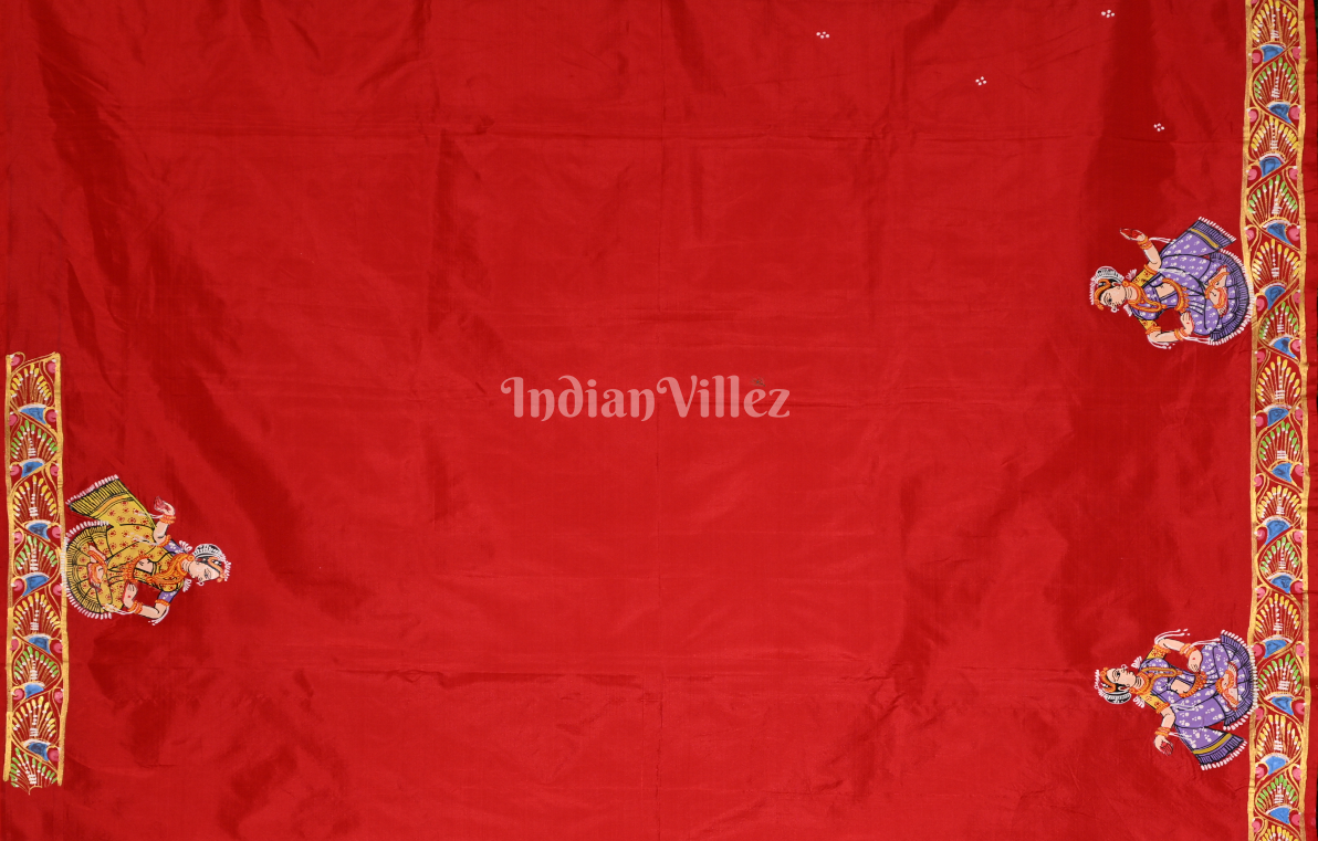 Red Ramayan Theme Hand-Painted Pattachitra Saree