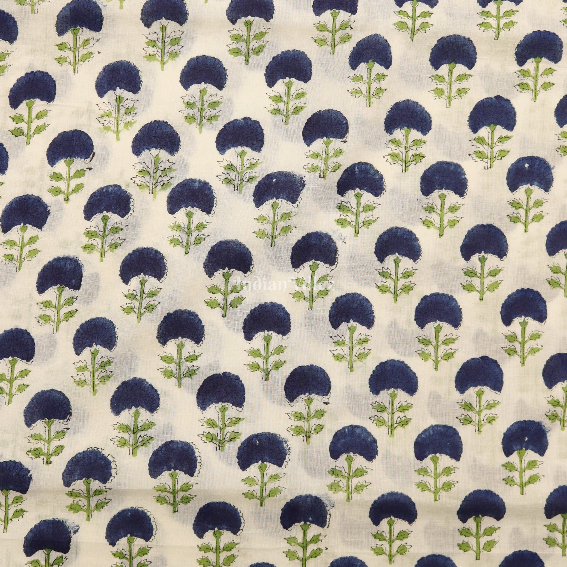White Blue Flower Motif Hand Block Printed Cotton Fabric